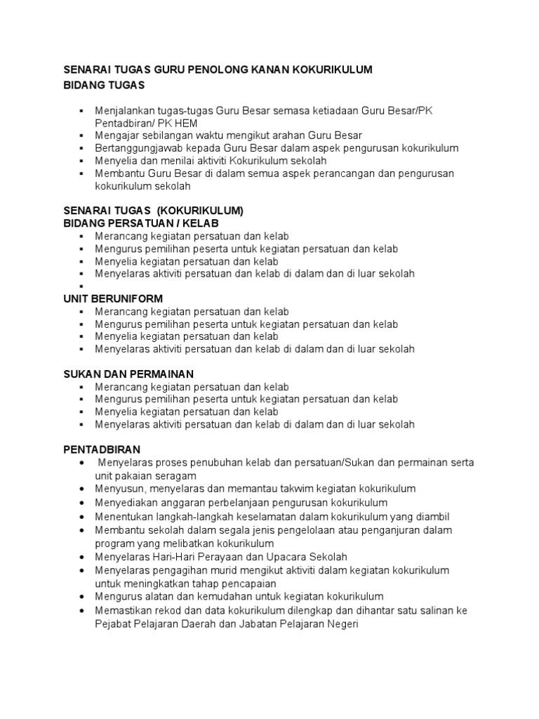 Senarai Tugas Penolong Kanan Kokurikulum Tugas Guru Otosection