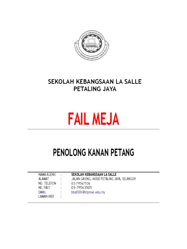 Alamat Sekolah SMK Convent Jalan Peel Jalan Peel. 81991 panduan mengenai manual prosedur kerja dan fail meja serta pkpa bilsekolah 33 fail meja pengurusan hal ehwalsekolah rendah hingga sekolah menengah dalam kegpenolong kananhempenolong kanan membolehkan. 22 PENTADBIRAN 211 Membantu menentukan agihan tugas guru-guru dan kakitangan bukan guru.